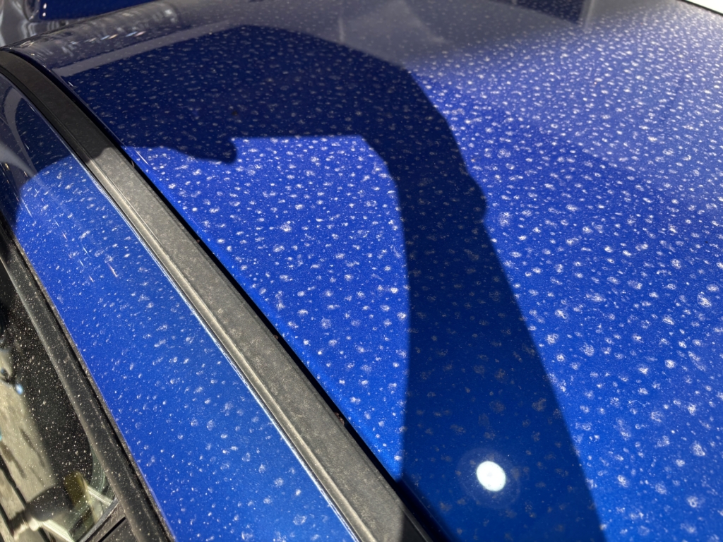 写真のような白い点々は、雨のあとに残る跡(雨ジミのような状態)で、2月は特に出やすいタイミングです。寒さで洗車の回数が減りやすい一方、雨汚れ・路面の汚れが重なって、ボディ表面に汚れが残りやすい季節でもあります。